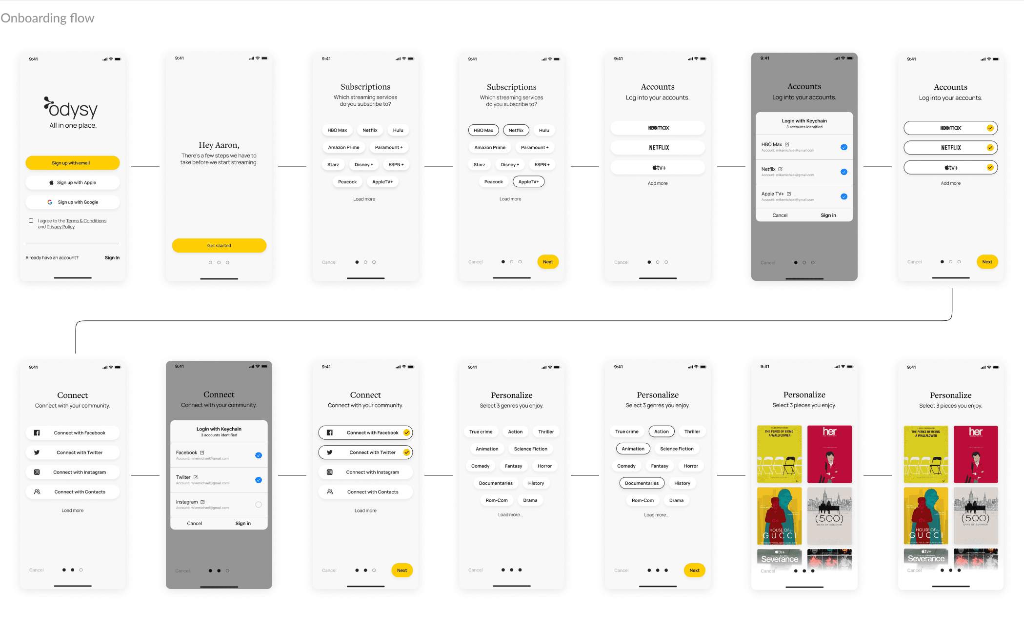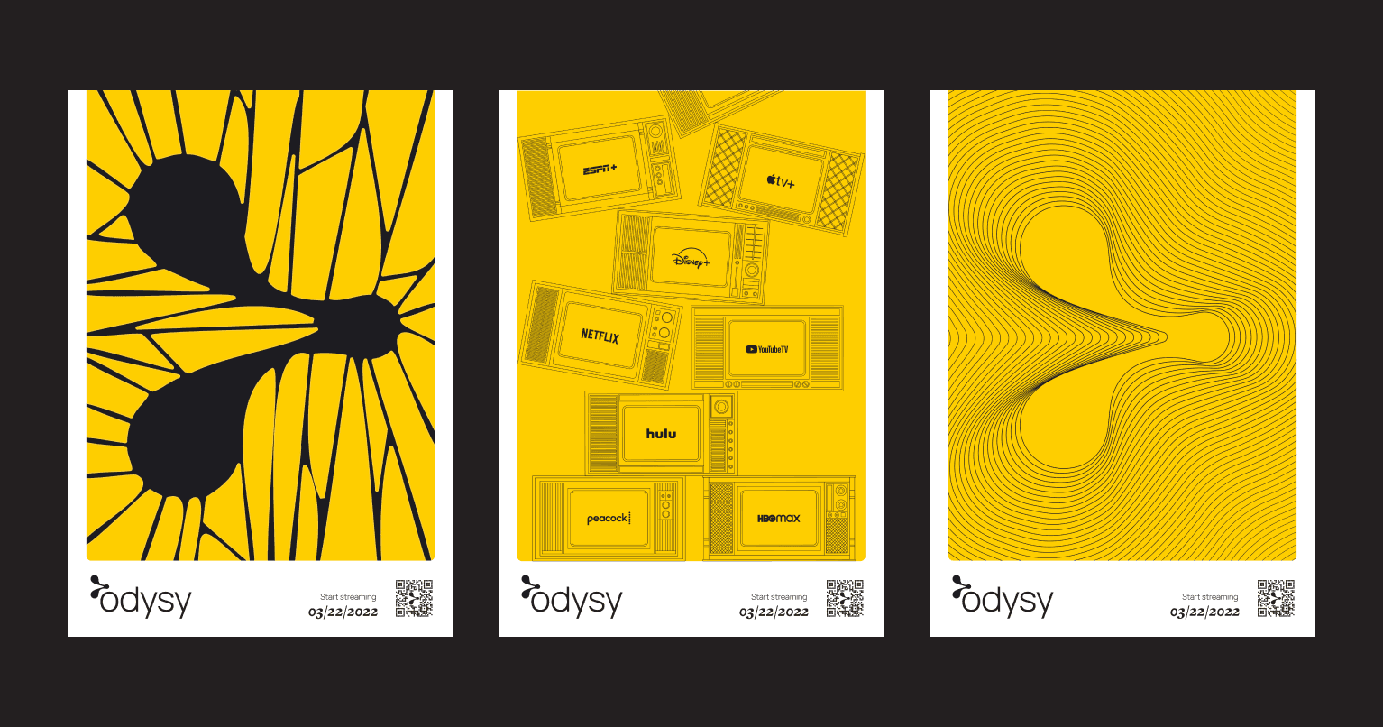 Streaming has exploded into the same kind of fragmentation we used to hate about cable—too many apps, too much friction, too much time spent deciding. Odysy is a concept product that brings your streaming services into one place, with a UX designed for clarity and an identity designed to feel public-facing, trustworthy, and human. This work combined end-to-end UX/UI design (flows → prototypes → UI kit) with a full brand system and campaign assets, all grounded in audience research and market/competitive analysis.